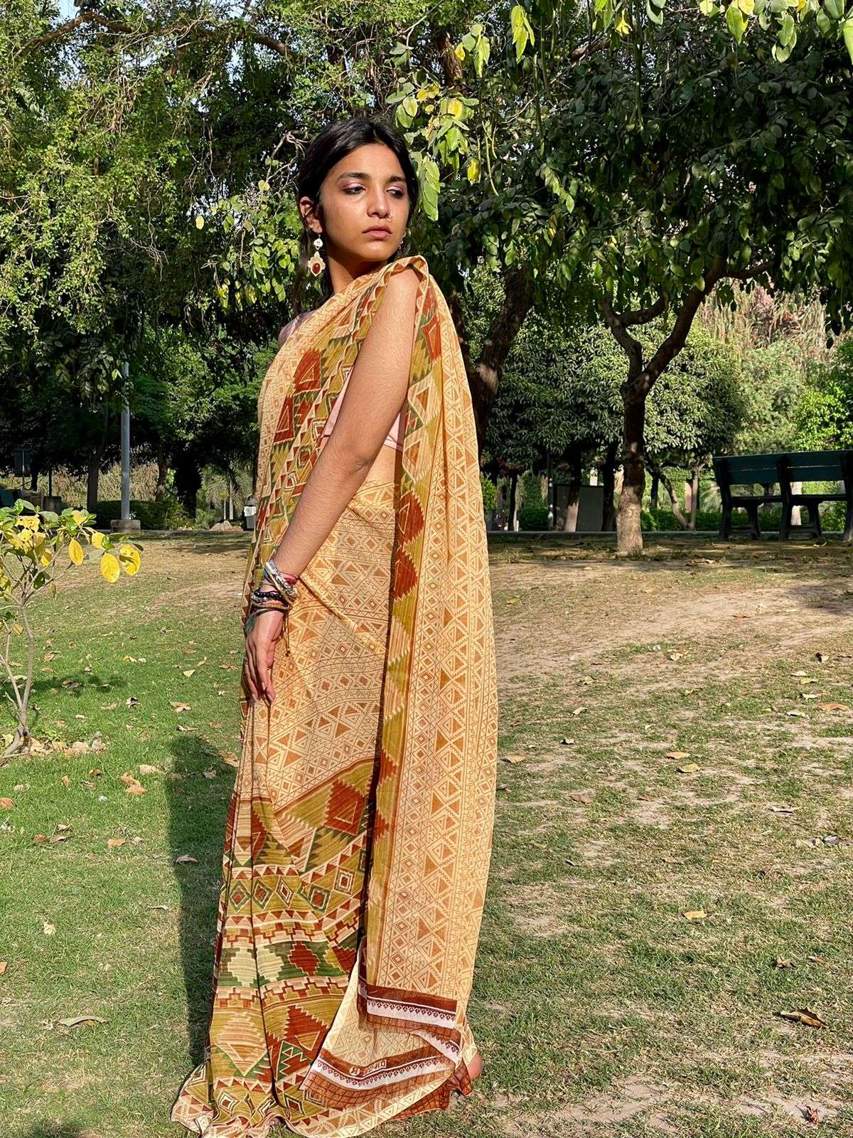 Caramel beige Indian chiffon saari with geometrical triangular and square shapes all over. The colors of the patterns include green, brick red, and beige.