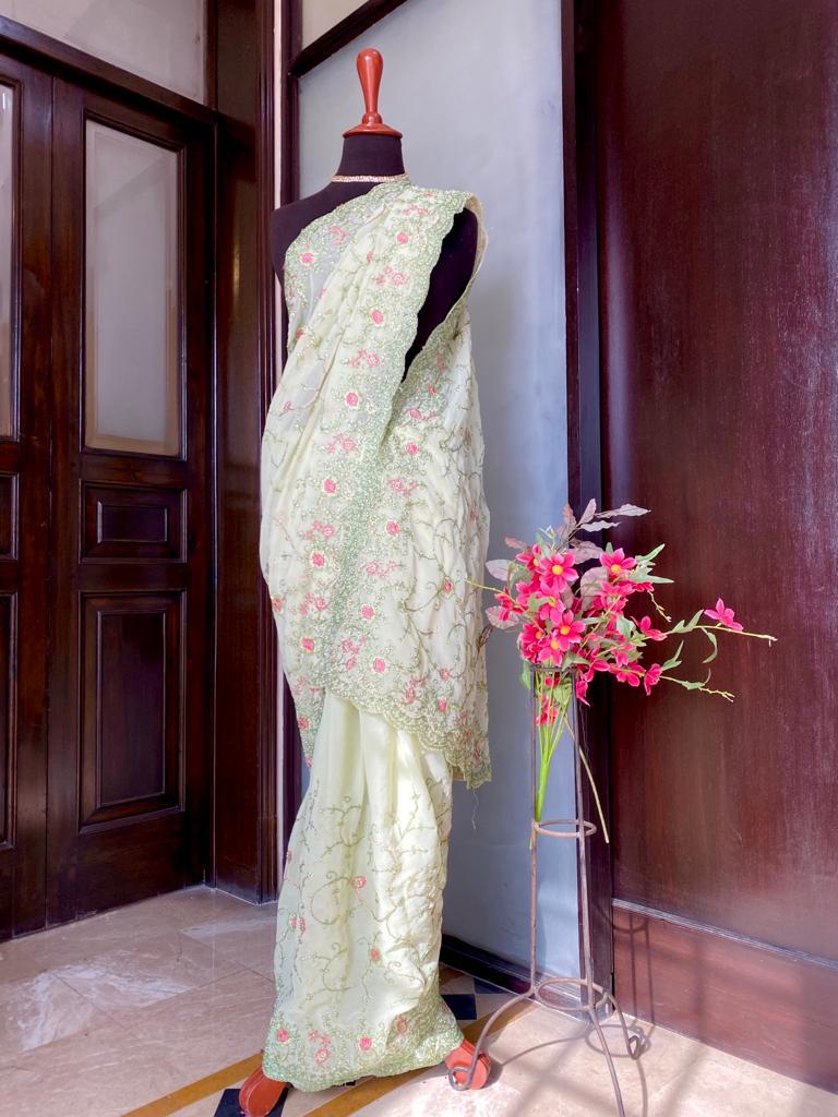 Embellished with the highest artistry in zardozi work and tangled floral threadwork.