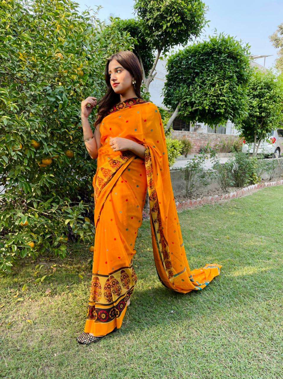 Soft and lightweight summer printed georgette saari in mustard yellow color. Blouse fabric is included in the same color with smaller geometric abstract patterns.